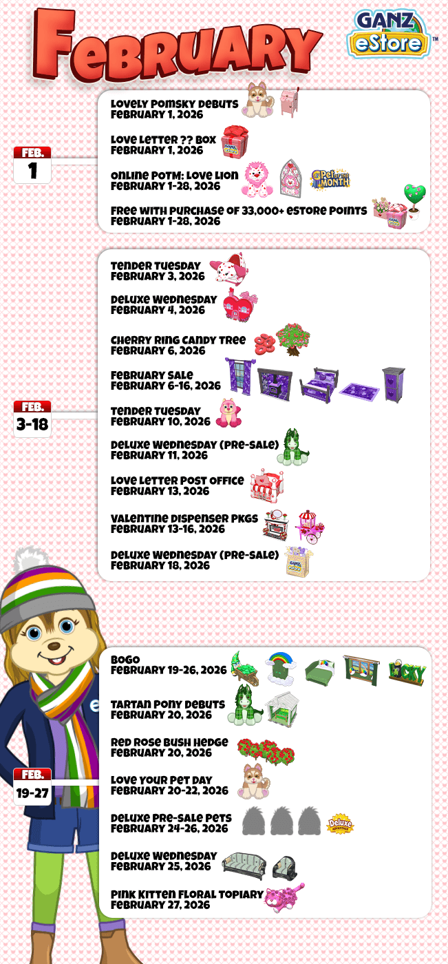 There are five new plush pets coming to Webkinz in February: Highland Cow, Chocolate Lab, Black and White Cat, Corgi, and Capybara!
