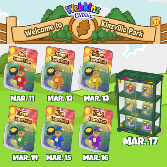 From March 11 – 17, look for the Leprechaun at Kinzville Park on the Webkinz Classic Desktop App, and click on him to get a new prize every day! He will be featured in the same spot all day and won’t disappear; however, his location will change each day.