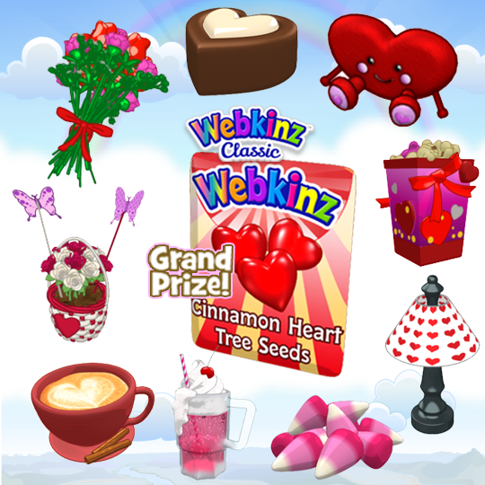 February 10 – 19, clickthe floating Magic W on your Webkinz Classic account to win a prize! There are ten repeat prizes to collect, including the grand prize: Cinnamon Heart Tree Seeds!