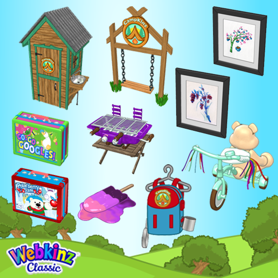 From July 7 – 14, click on Arte in Kinville Park to get a gift each day. There are four new prizes to collect: Webkinz Year 20 Coin, Mounted Pickaxe, Cave Critter Plushy, and Melting 8 Ball Candle: