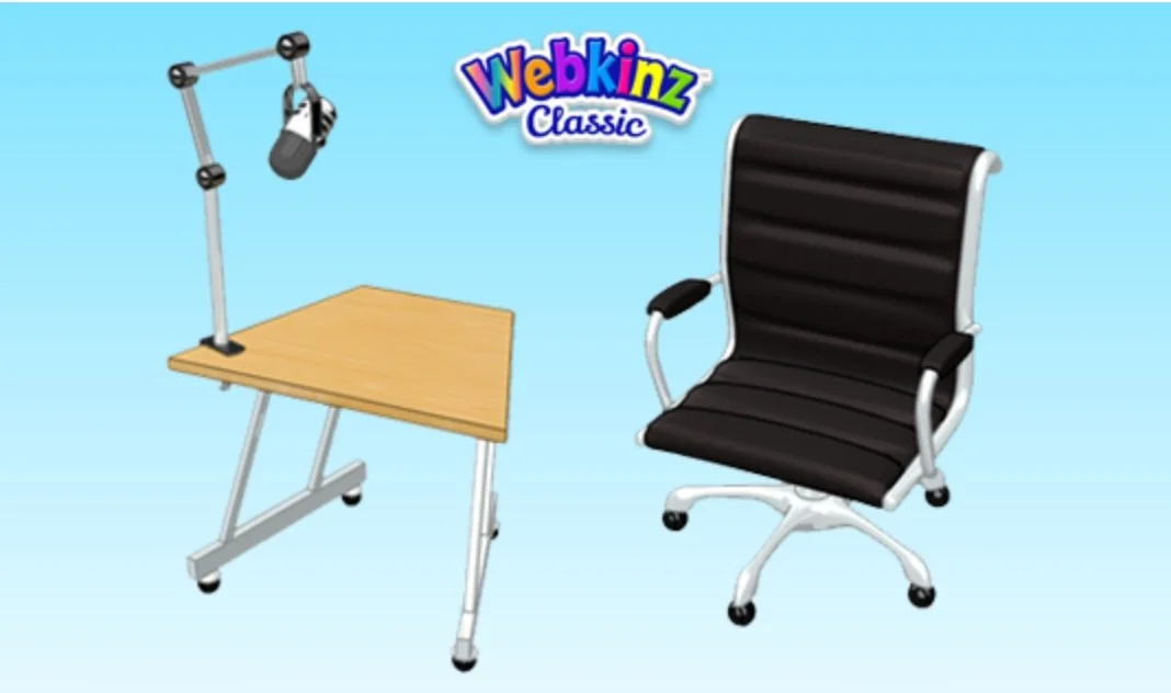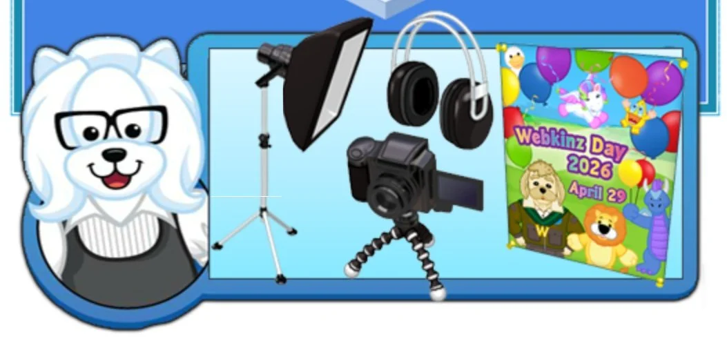 Click Ella McWoof in the Webkinz News Room in the Clubhouse daily to collect a new gift: Newz Vlogger Light, Newz Vlogger Headphones, Newz Vlogger Camera, Webkinz Day 2026 Poster
